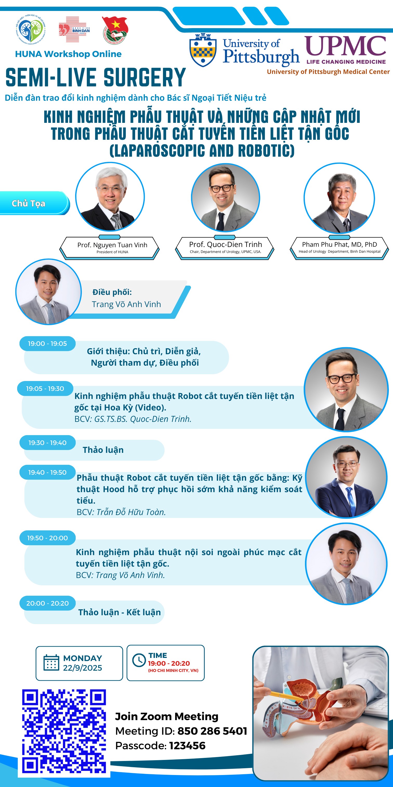 KINH NGHIỆM PHẪU THUẬT VÀ NHỮNG CẬP NHẬT MỚI TRONG PHẪU THUẬT CẮT TUYẾN TIỀN LIỆT TẬN GỐC (LAPAROSCOPIC AND ROBOTIC) 23-09-2025 08:56:40 GMT +7 |